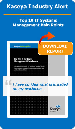 Kaseya is the leading global provider of IT Systems Management software. Kaseya’s solutions empower virtually everyone –– from individual consumers to large corporations and IT service providers –– to proactively monitor, manage and control IT assets remotely, easily and efficiently from one integrated Web-based platform. For a free 30 day trial of the Kaseya solution, please visit http://www.kaseya.com |